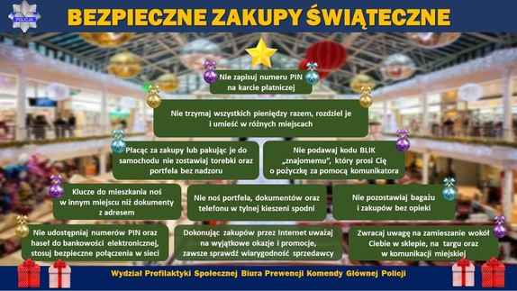 Zbliżają się Święta Bożego Narodzenia. Dla wielu z nas najbliższe dni będą wiązać się z zakupami i przygotowaniami do tych rodzinnych świąt. Niestety dla innych będzie to czas sprzyjających okazji na przykład do kradzieży. Dlatego poniżej zamieszczamy kilka rad prawidłowego zachowania się, aby uniknąć nieprzyjemnych sytuacji i nie dać się okraść.