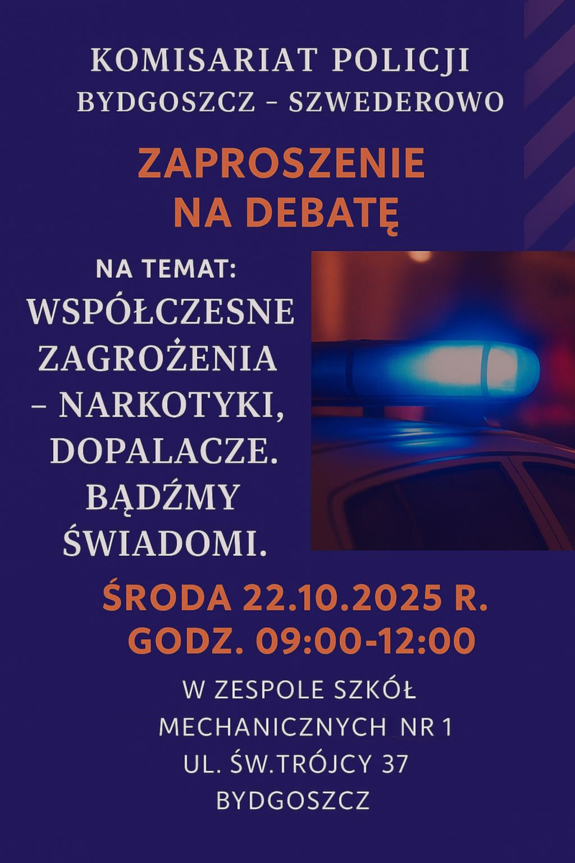 Komendant Komisariatu Policji Bydgoszcz-Szwederowo zaprasza na debatę społeczną na temat „Współczesne zagrożenia - narkotyki, dopalacze. Bądźmy świadomi”. Odbędzie się ona 22 października 2025 roku o godz. 9:00 w auli Zespołu Szkół Mechanicznych nr 1 w Bydgoszczy przy ul. Św. Trójcy 37. Skierowana jest dla wszystkich zainteresowanych zagadnieniem.