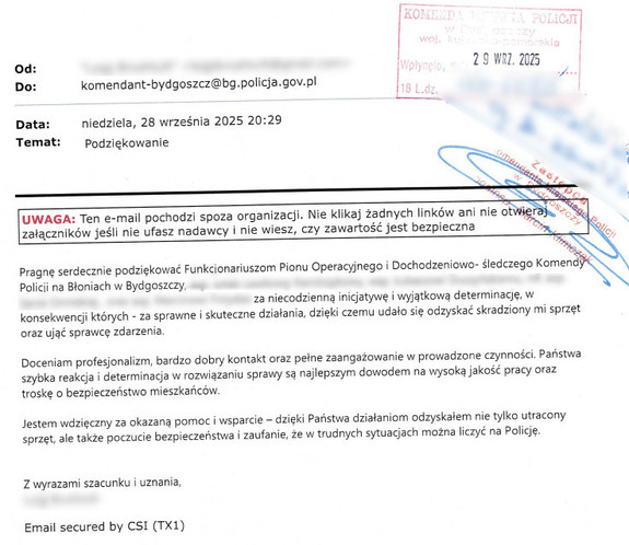 Na skrzynkę mailową Komendanta Miejskiego Policji w Bydgoszczy wpłynęły podziękowania dla policjantów z Błonia za ich zaangażowanie, niecodzienną inicjatywę oraz wyjątkową determinację podczas czynności związanych ze zgłoszeniami dotyczącymi kradzieży i włamań. Jak podkreśla autor finałem tego było zatrzymanie sprawcy tych przestępstw i odzyskanie skradzionego sprzętu, w tym także należącego do niego.
