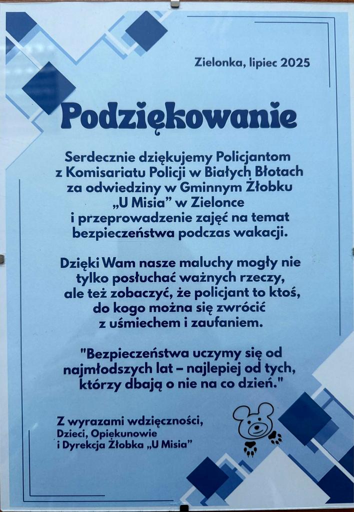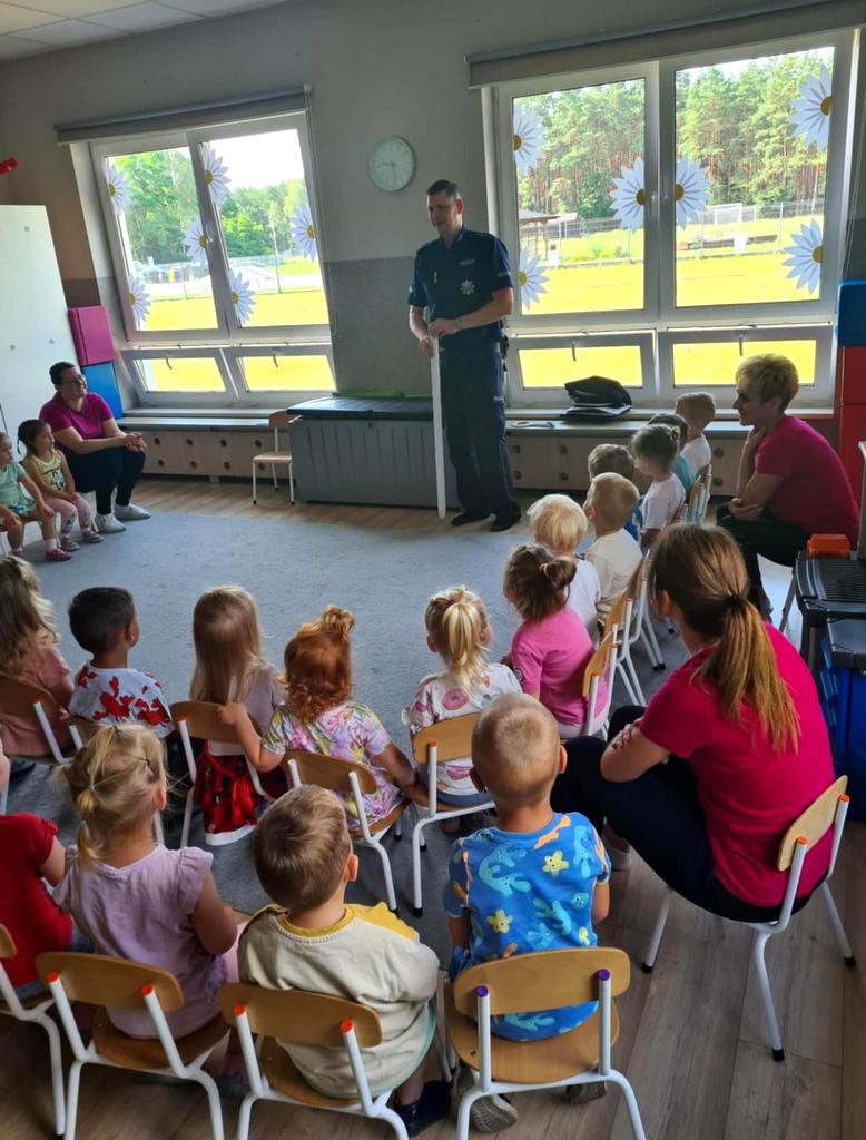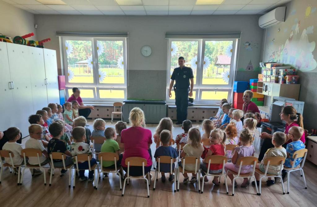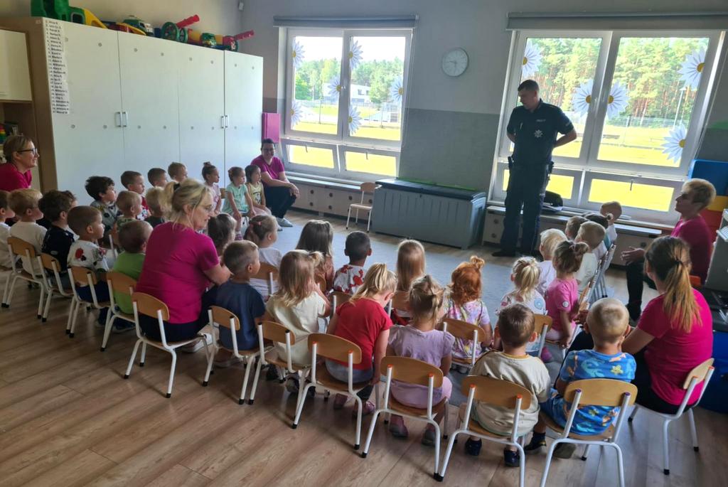 Wczoraj (15.07.2025) aspirant Michał Kaiser z Komisariatu Policji w Białych Błotach odwiedził Gminny Żłobek "U Misia" w miejscowości Zielonka.