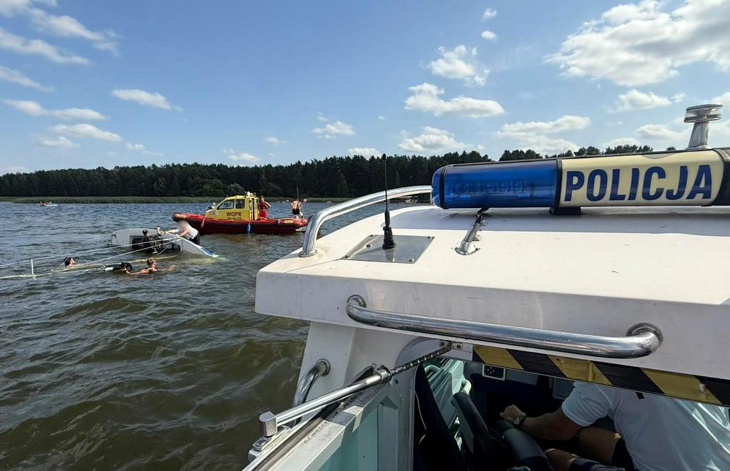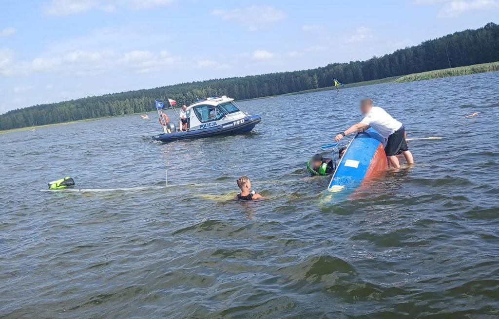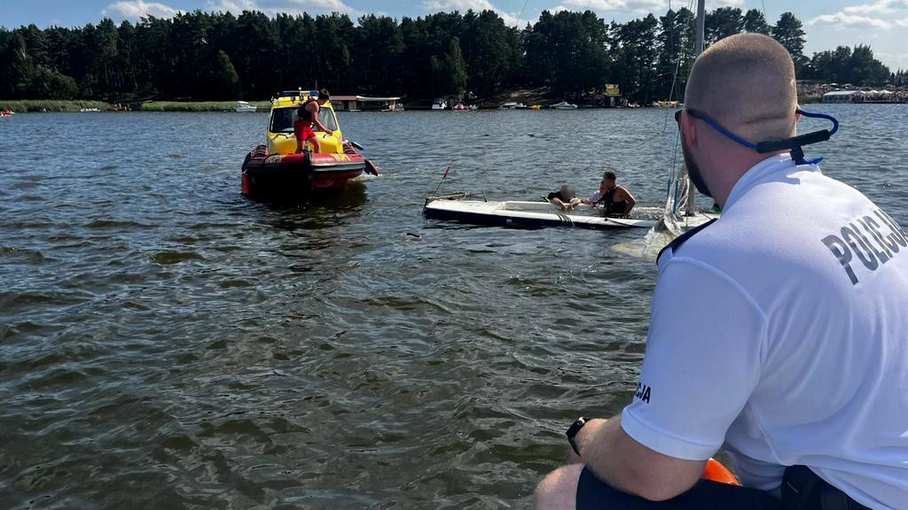 Gdy policjanci upewnili się, że tym żeglarzom już nic nie grozi ruszyli na pomoc innym. Zauważyli bowiem wywróconą łódź, a wokół niej pływających trzech mężczyzn. Ratownicy WOPR z Pieczysk, którzy dołączyli do policjantów wyciągnęli z wody do siebie na pokład załogę, a mundurowi zabezpieczyli łódź, aby ta się nie zatopiła. Po czym wypompowali wodę i odholowali żaglówkę do przystani w Pieczyskach. Na szczęście nikt w tym zdarzeniu nie ucierpiał.