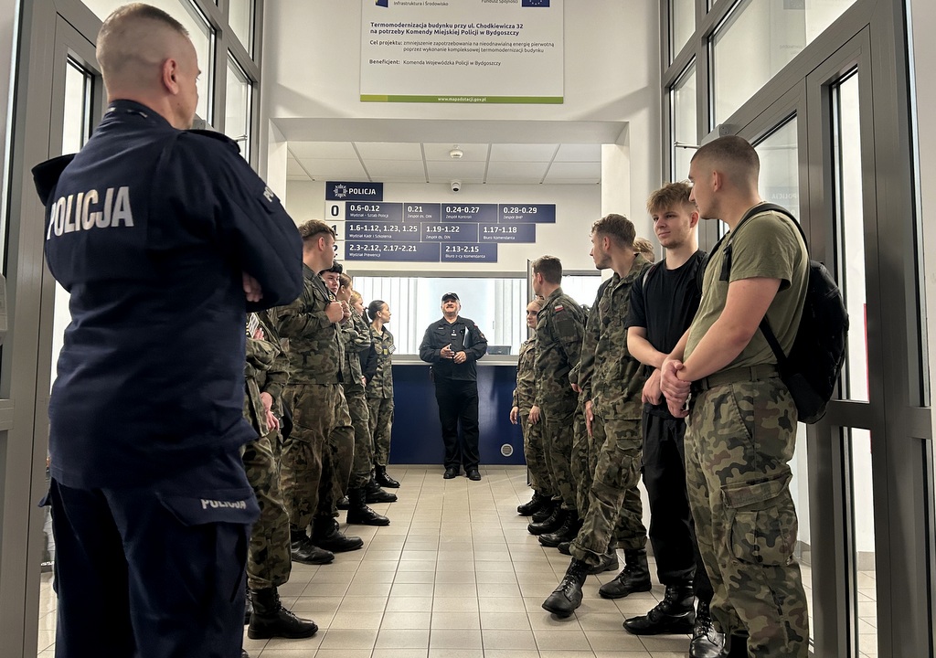 Uczniowie Szkoły Technicznej im. 1. Pomorskiej Brygady Logistycznej Bydgoskiego Zakładu Doskonalenia Zawodowego w Bydgoszczy uczestniczyli w zajęciach zorganizowanych w Komendzie Miejskiej Policji w Bydgoszczy. Spotkanie odbyło się w ramach współpracy policjantów z młodzieżą zainteresowaną przyszłą służbą w formacjach mundurowych.