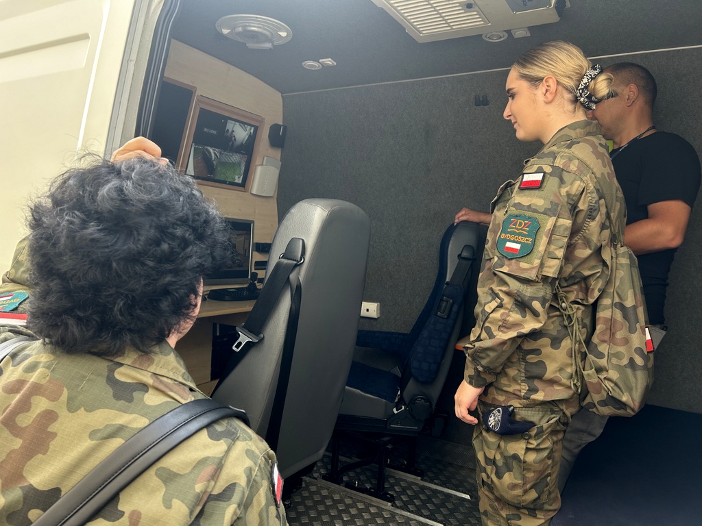Podczas czwartkowej (11.09.2025) wizyty uczniowie mieli okazję zapoznać się z zadaniami realizowanymi przez Sztab Policji, a także zobaczyć stanowisko dowodzenia bydgoskiej komendy. Funkcjonariusze przygotowali również prezentację mobilnego centrum monitoringu, które wykorzystywane jest podczas dużych zabezpieczeń.