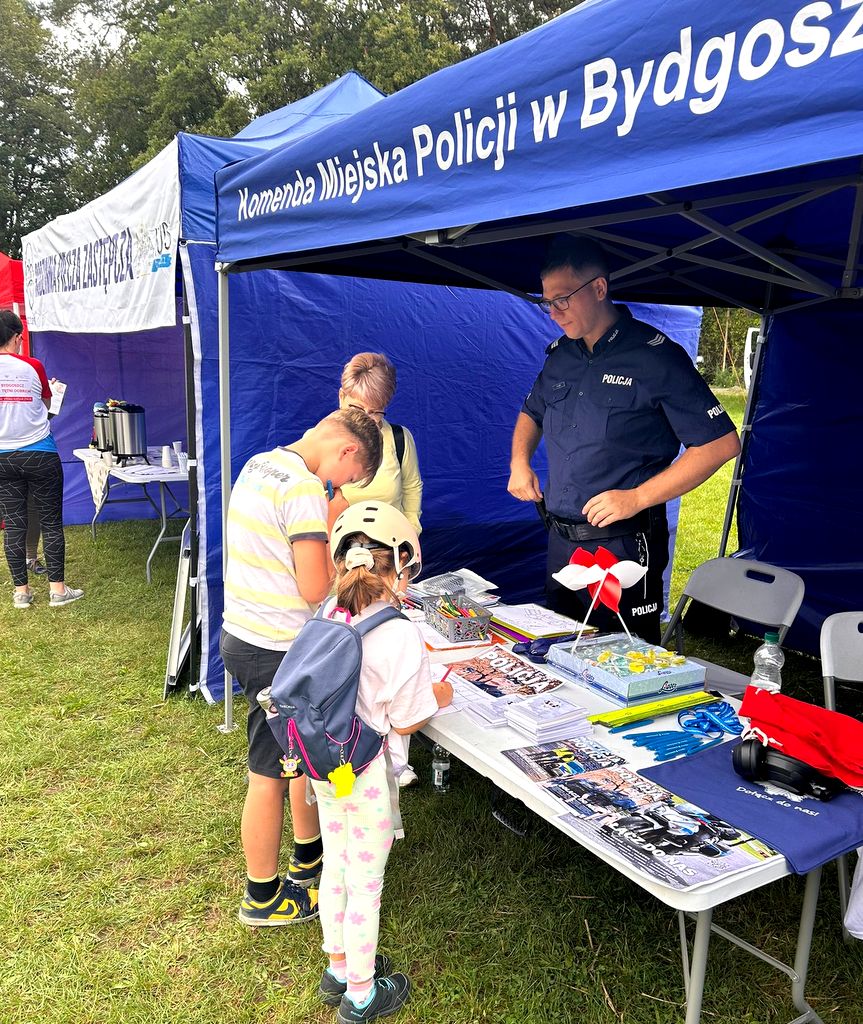 Nie był to jednak jedyny policyjny akcent w tym wydarzeniu. Profilaktyk z bydgoskiej komendy miejskiej sierżant sztabowy Michał Łazur czekał na zainteresowanych uczestników wydarzenia pod namiotem profilaktycznym. Osoby odwiedzające mogły porozmawiać z funkcjonariuszem o bezpieczeństwie, obejrzeć wykorzystywany w codziennej służbie sprzęt, a także dowiedzieć się więcej o pracy policji. Najmłodsi uczestnicy z entuzjazmem zadawali pytania, na które mundurowy chętnie odpowiadał.