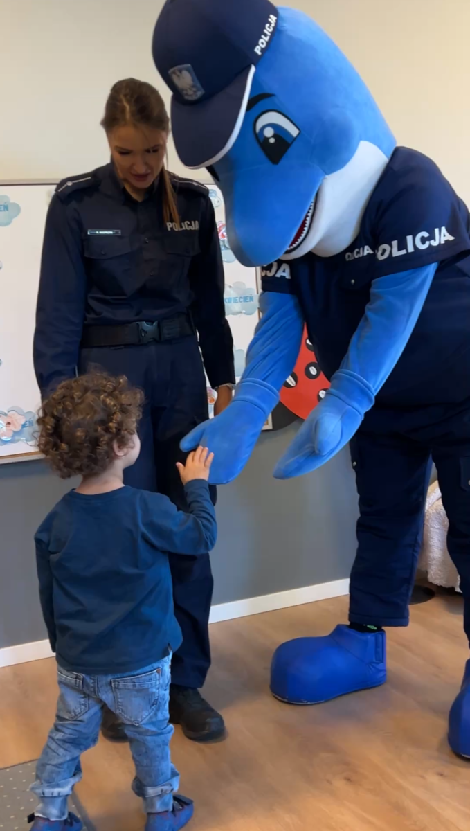 Nie zabrakło również radości i uśmiechów – spotkanie uatrakcyjniła maskotka kujawsko-pomorskiej Policji – Polfinek, który chętnie przybijał dzieciom piątki i zachęcał do wspólnej zabawy.