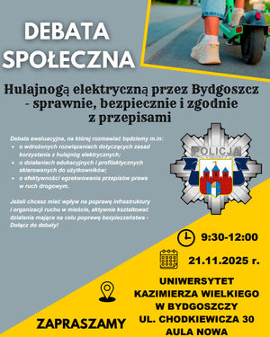 Komendant Miejski Policji w Bydgoszczy zaprasza mieszkańców Bydgoszczy na debatę ewaluacyjną „Hulajnogą elektryczną przez Bydgoszcz - sprawnie, bezpiecznie i zgodnie z przepisami”. Odbędzie się ona 21 listopada 2025 roku i skierowana jest do mieszkańców naszego miasta. Rozpoczęcie o godz. 9:30 w Auli Nowa Uniwersytetu Kazimierza Wielkiego w Bydgoszczy przy ul. Chodkiewicza 30.