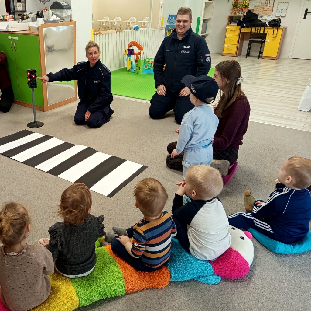Podczas poniedziałkowego (17.11.2025) spotkania, policjanci opowiadali najmłodszym o swoich codziennych obowiązkach służbowych, wyjaśniając, w jaki sposób dbają o bezpieczeństwo mieszkańców. Dzieci miały również okazję ćwiczyć prawidłowe przechodzenie przez jezdnię oraz zapoznać się z zasadami działania sygnalizacji świetlnej.