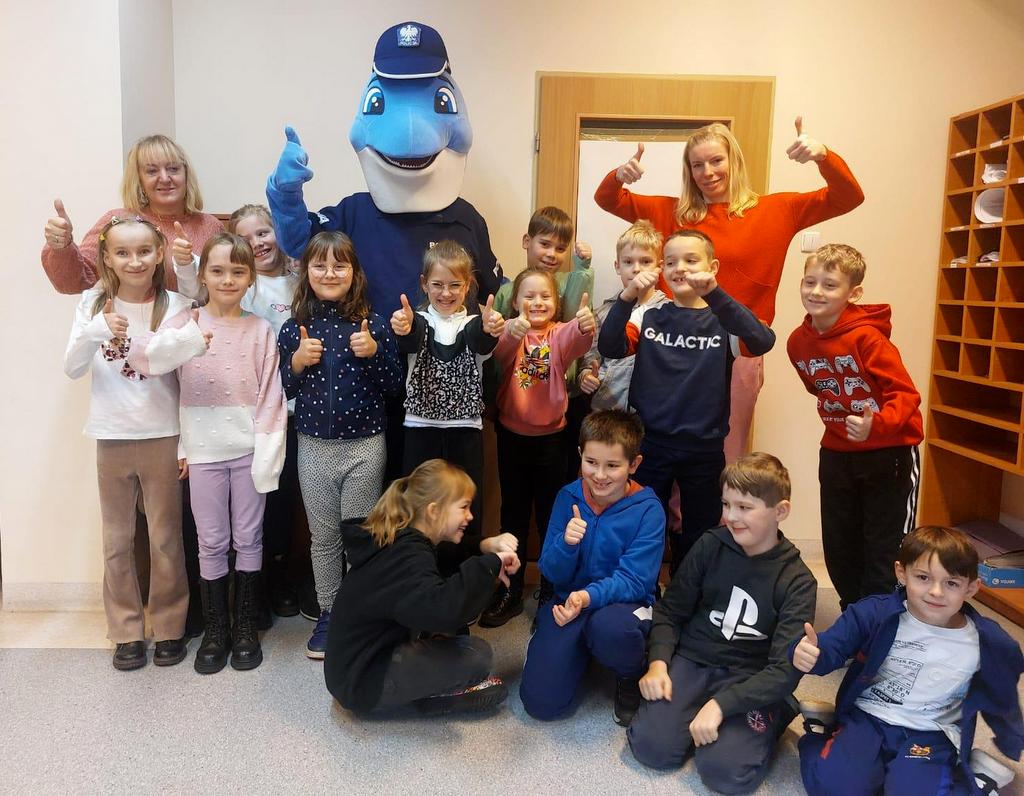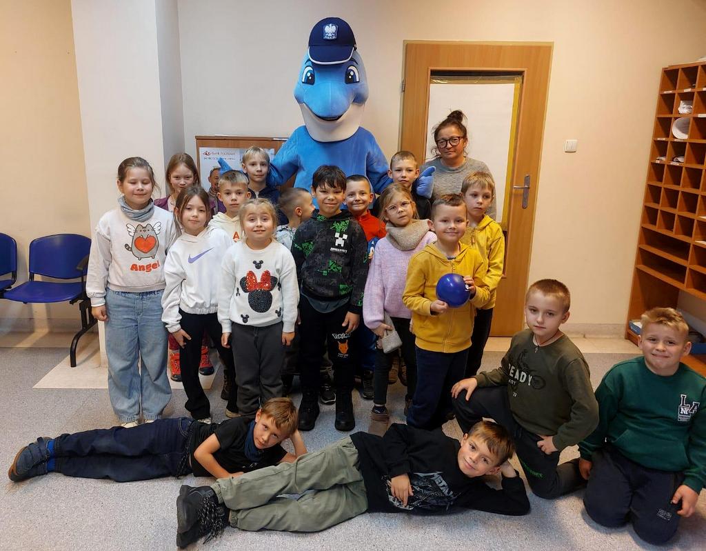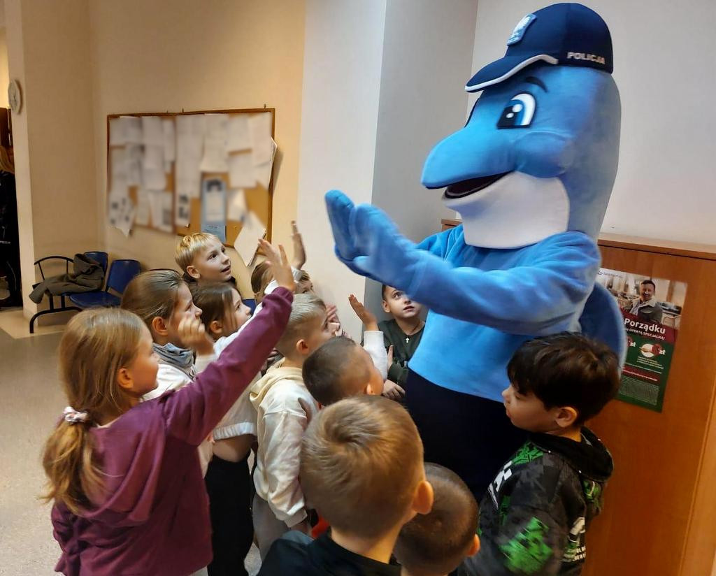Spotkanie dodatkowo umilił Polfinek, z którym zrobiono sobie pamiątkowe zdjęcia. Wizyta na komisariacie sprawiła dzieciom ogromną radość, obfitowała w wiele dla nich atrakcji. Przede wszystkim jednak dzięki niej młodzi ludzie poznali szczególny zawód policjanta.