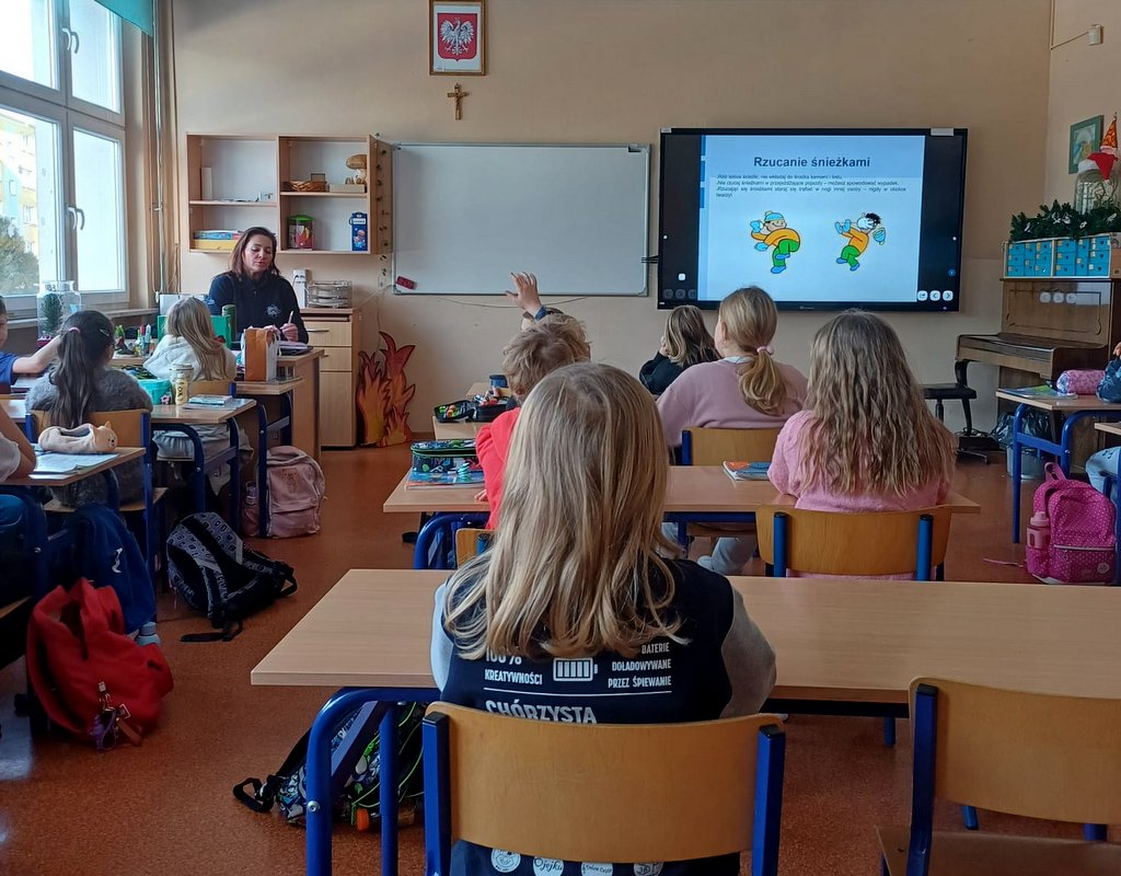 W ubiegłym tygodniu (08-09.01.2026) profilaktycy z komisariatu na Wyżynach spotkali się z uczniami Szkoły Podstawowej nr 38 przy ul. Węgierskiej 11 w Bydgoszczy, by przeprowadzić z nimi zajęcia dotyczące szerokiego pojęcia, jakim jest bezpieczeństwo w domu, w ruchu drogowym, a także w innych miejscach. Był to doskonały moment, by przybliżyć najmłodszym również najważniejsze zasady bezpiecznego wypoczynku podczas zbliżających się ferii zimowych. Uczniowie obejrzeli z tej okazji specjalnie przygotowaną prezentację multimedialną.