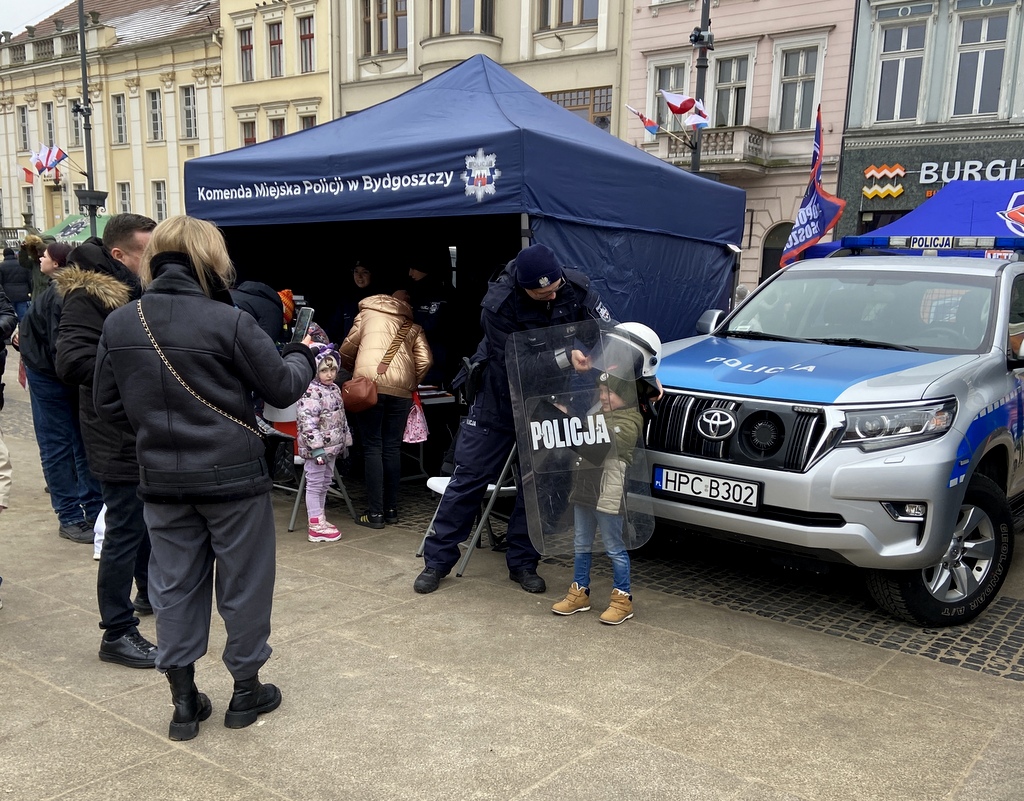 Funkcjonariuszy z Wydziału Prewencji Komendy Miejskiej Policji w Bydgoszczy można spotkać pod namiotem profilaktycznym ustawionym na Starym Rynku w Bydgoszczy. Ich obecność skierowana jest szczególnie do dzieci, dla których policjanci mają przygotowane krzyżówki, rebusy i zagadki kryminalistyczne. Towarzyszy im koleżanka z Wydziału Techniki Kryminalistycznej Komendy Miejskiej Policji w Bydgoszczy, która wykonuje chętnym pamiątkowe odbitki linii papilarnych i opowiada o specyfice swojej służby.