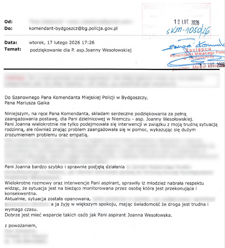 Funkcjonariusze każdego dnia z zaangażowaniem wypełniają swoje obowiązki, nie oczekując w zamian słów uznania, jednak te kilka miłych zdań doceniających pracę bydgoskiej policjantki z pewnością będzie dla niej cenną nagrodą za wzorową postawę, a zarazem motywacją do dalszej służby.