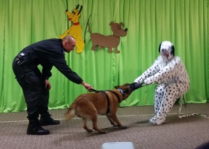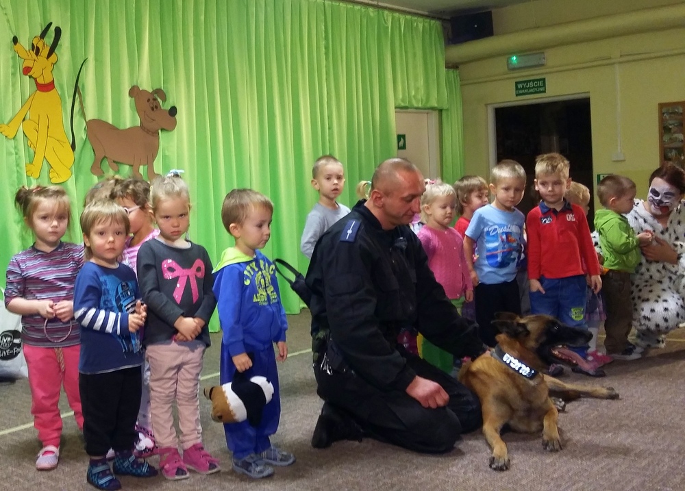 Przedszkolaki przywitały policjantów wraz z Panią wychowawczynią, która wcieliła się w tym dniu w rolę psa „dalmatyńczyka”. Na spotkaniu policjanci opowiedzieli o pracy policyjnych psów oraz jak ważne jest dbanie o swojego pupila. Mł.asp. Arkadiusz Ludkiewicz, przewodnik psa służbowego wraz ze swoim partnerem "Tajem" pokazali jak wyszkolony jest policyjny czworonóg.